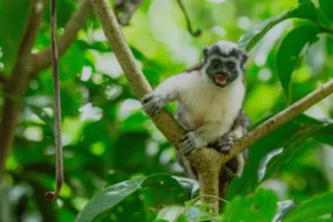 A small wigwam monkey perches on a forked branch. Panama’s forests are home to over 400 animal and plant species.